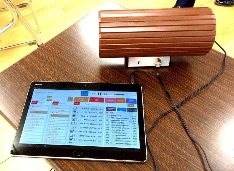 1300以上の音(周波数)の項目の中から音を選び、専用のスピーカーから出る音(周波数)をお身体の部分に当てます。(スピーカーと身体は少し離します。)